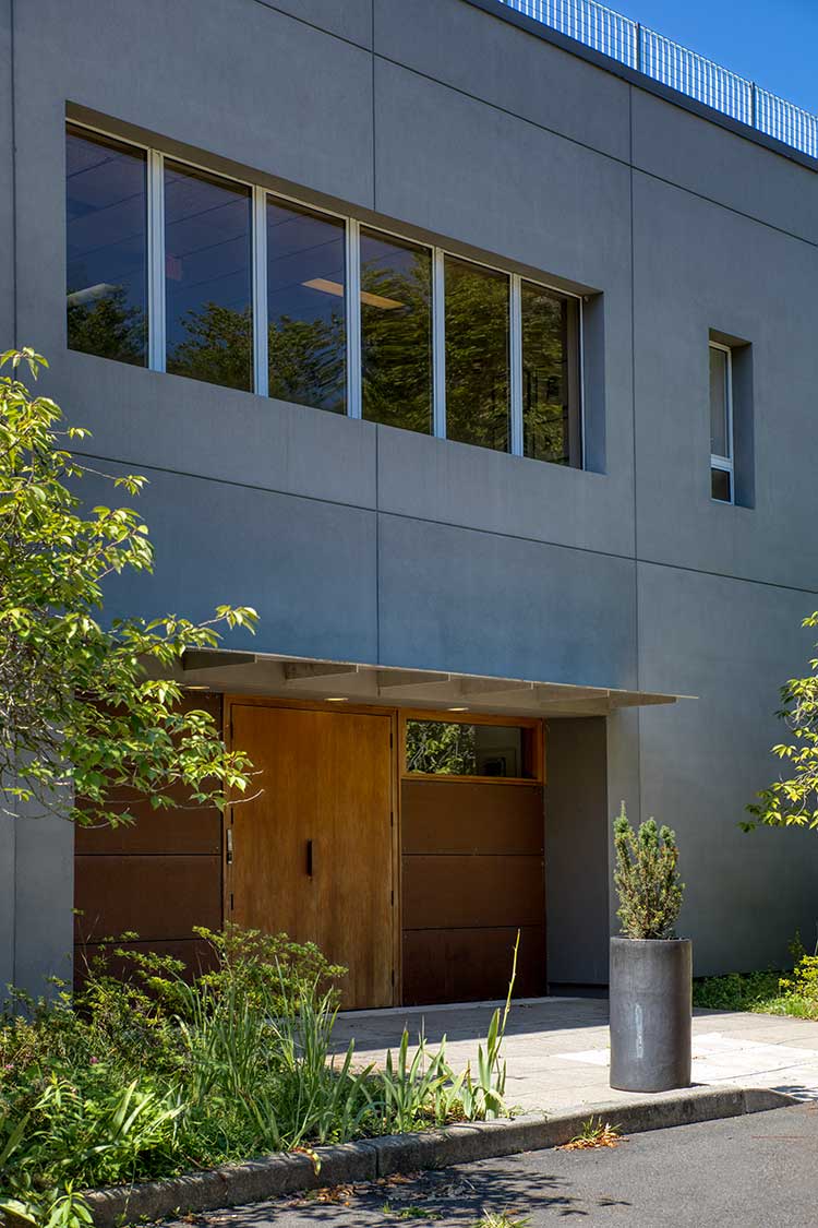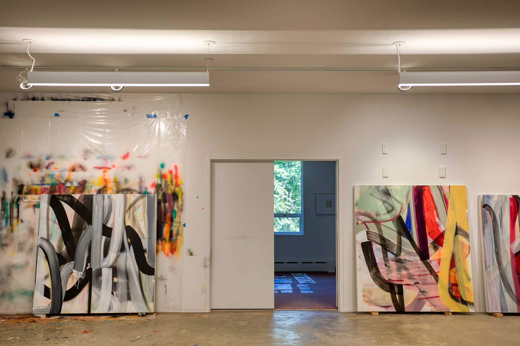 A two-story concrete block office building was renovated to be an artist’s studio, office and archival space. A floor was removed to create a 24-foot ceiling in the large studio area and clerestory windows provide indirect natural light. Other areas of the building include a second painting studio, library, offices and storage.